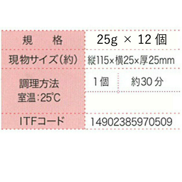 1箱の入り数 25g × 12個 規格サイズ(約) 縦 115 × 横 25 × 厚さ 25mm 調理方法室温:25℃ 1個:約 30分 ITFコード 149023859702107